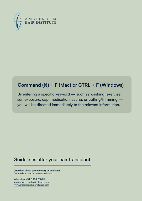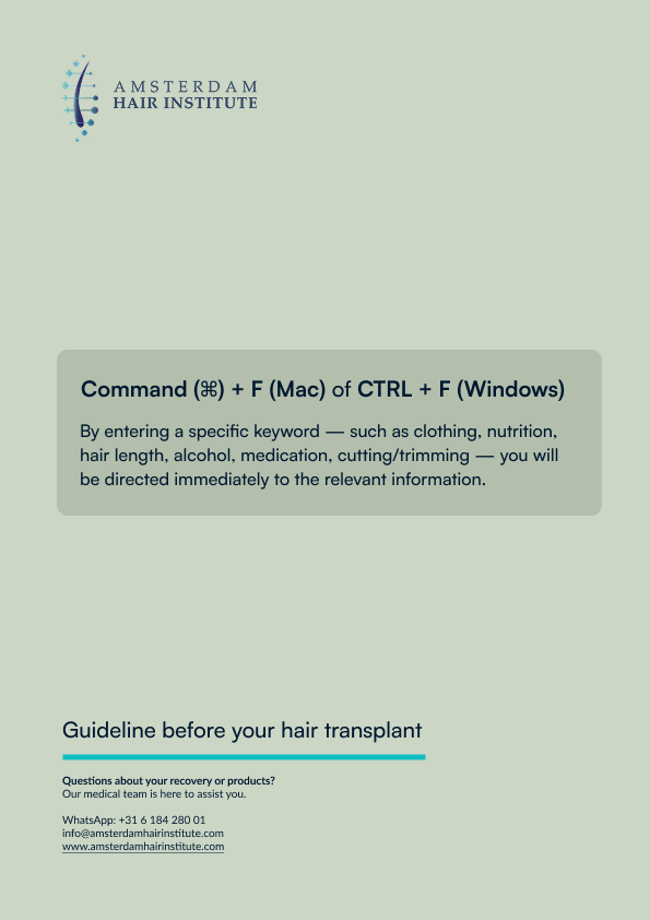 You can easily consult our complete pre- and post-operative guidelines for your hair transplantation online. We recommend opening the document on a computer or laptop and using the search function via Command (⌘) + F (Mac) or CTRL + F (Windows).