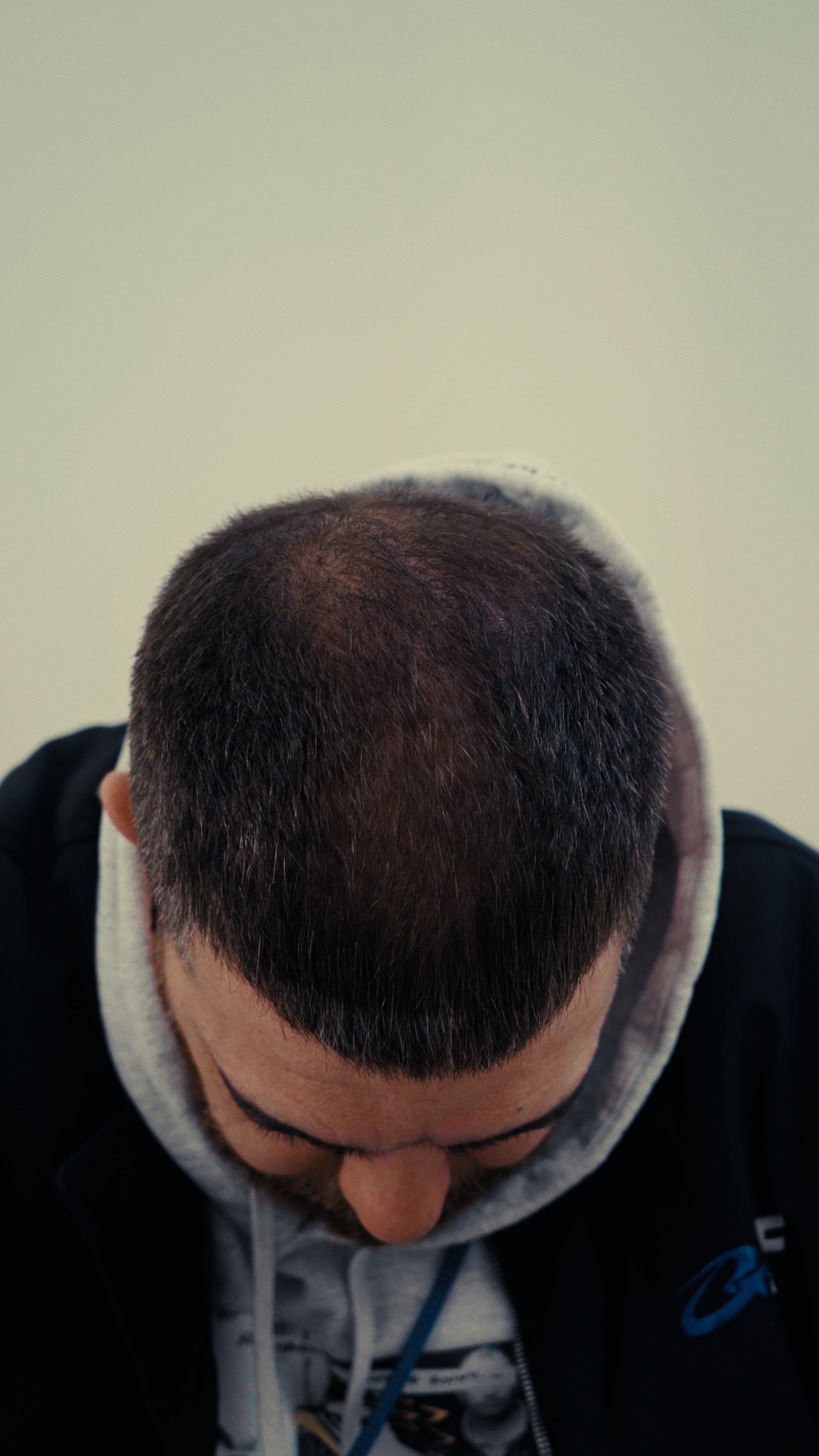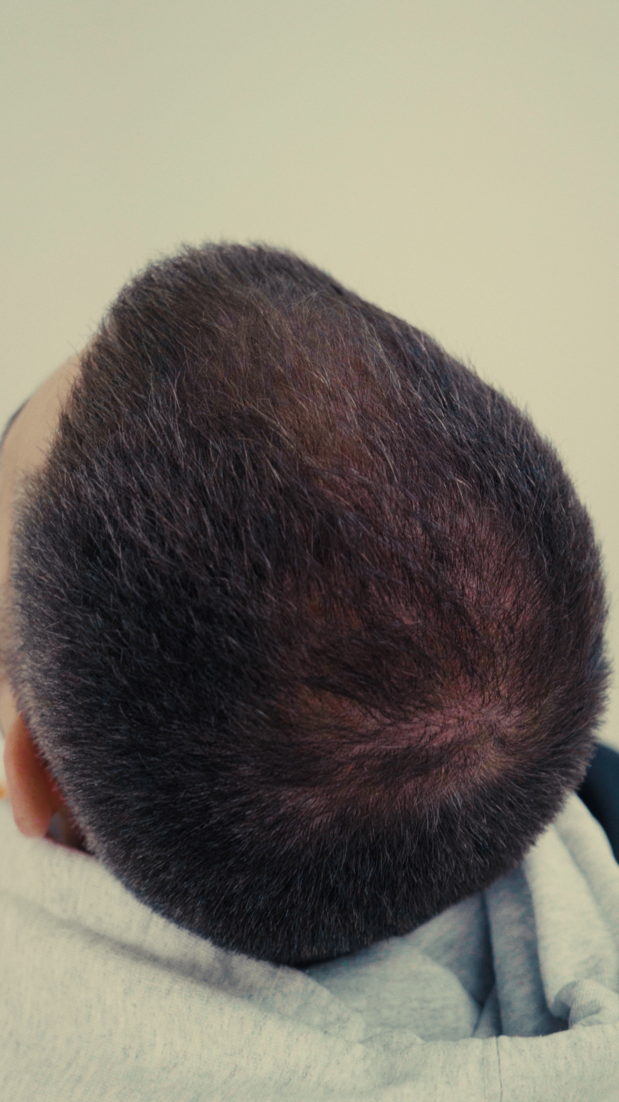Aan de voorkant en zijkanten groeit zijn haar nog sterk, maar bovenop werd het dunner. Daardoor ontstonden kleine “eilandjes” waar de dichtheid duidelijk minder was.